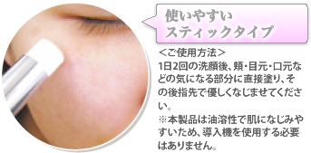 時間とともに移りゆく肌。30代を過ぎたら気になる部分の着実なケアが美肌の秘訣。 ★ご使用方法 1日2回の洗顔後、化粧水等でお肌を整えた後、気になる部分に直接塗り、その後指先で優しくなじませてください。 ※本製品は油溶性で肌になじみやすいため、導入器を使用する必要はありません。 ★内容量とご使用期間の目安 内容量 3.8g ★全成分表記 テトラヘキシルデカン酸アスコルビル、セレシン、キャンデリラロウ、マイクロクリスタリンワックス、アルガニアスピノサ核油、トコフェロール、ジメチコン、シリカ |