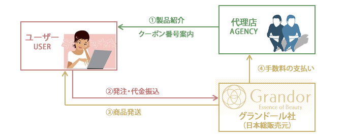 代理店は、対面やWEBなどで製品をご案内し、使用希望者にクーポンを発行して販売することで、契約コースに応じた報酬を手数料として受け取ることができます。